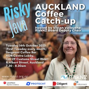 Vivian Valbuena, RiskNZ Board Deputy Chair meets monthly for our RiskNZ Coffee Catch-up’s in Auckland on the 1st Tuesday of every month.