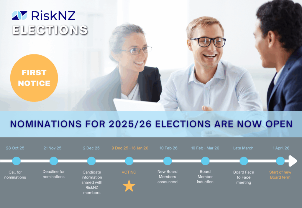 RiskNZ is seeking nominations from RiskNZ members for THREE vacancies to join the Board for 2 years.